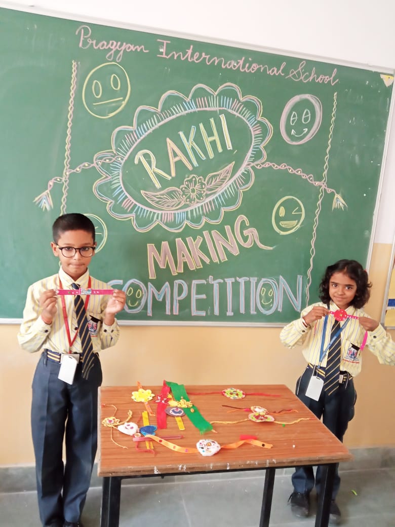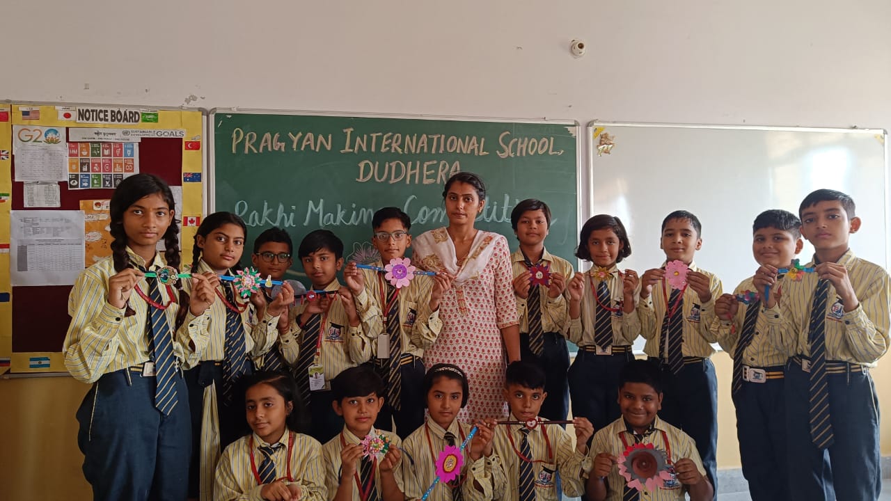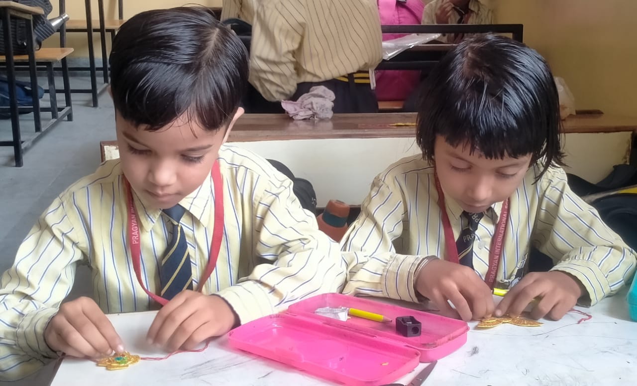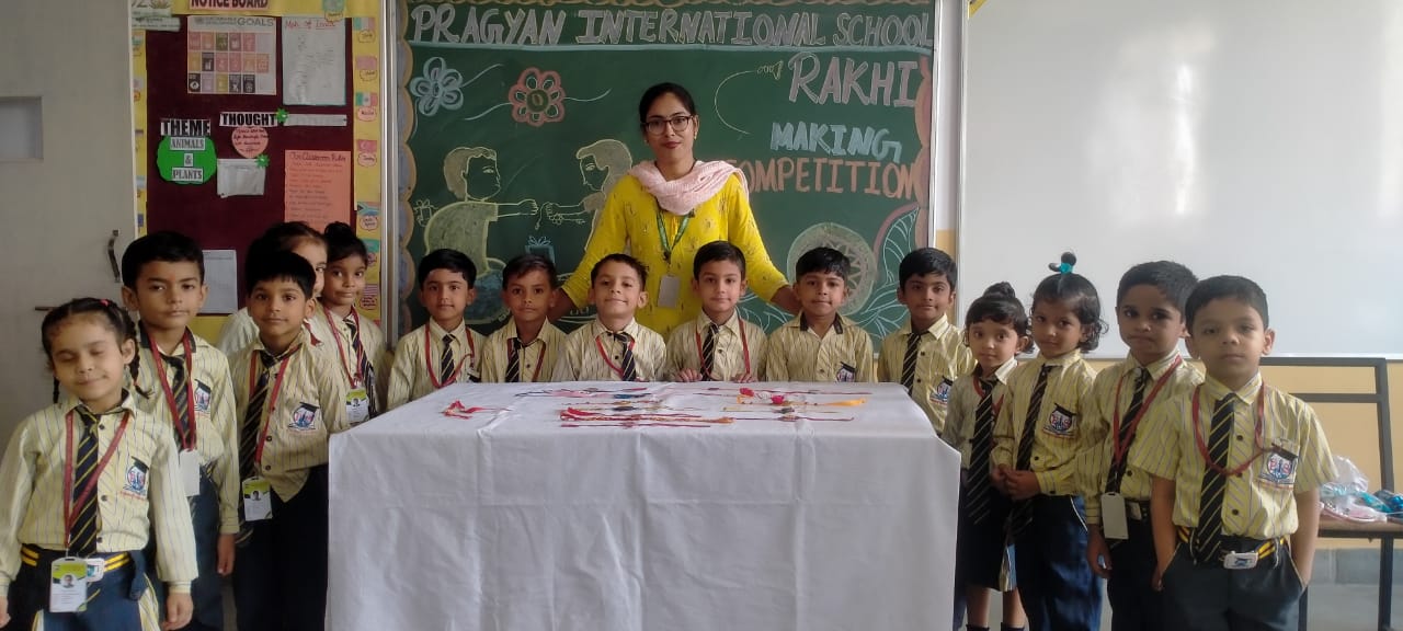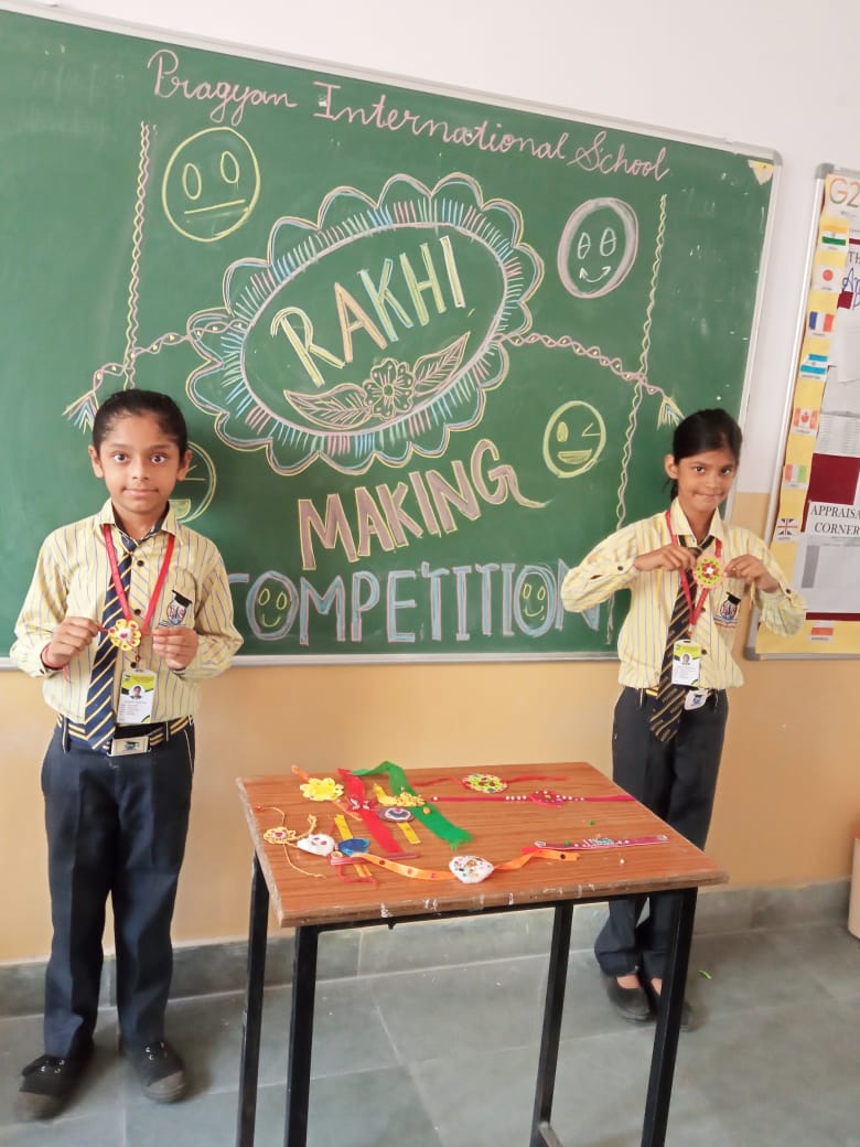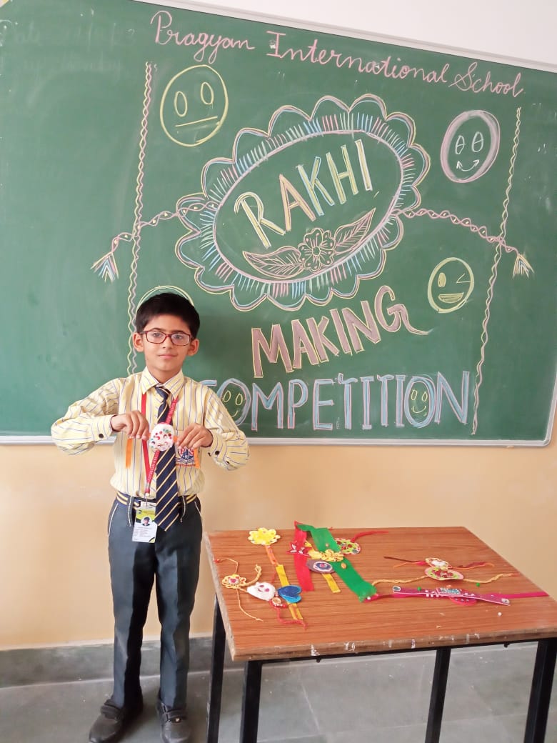 Description : 'Raksha Bandhan' or 'Rakhi' is a special occasion to celebrate the virtuous bond of love between a brother and a sister which is one of the deepest and noblest of all human emotions. 'Pragyan International School,Dudhera, organized'Rakhi Making Competition for the students from Class UKG to V and Mehandi Competition class VI to VIII on 28th August. The motive behind organizing competition is to enhance the skill of creativity and nurturing their inner talent.The competition started with full of enthusiasm among the students.All the students made beautiful Rakhi and Mehandi using different materials like ribbon, glitter,pearls, herbal etc under the guidance of their teachers .All the students thoroughly enjoyed the competition
