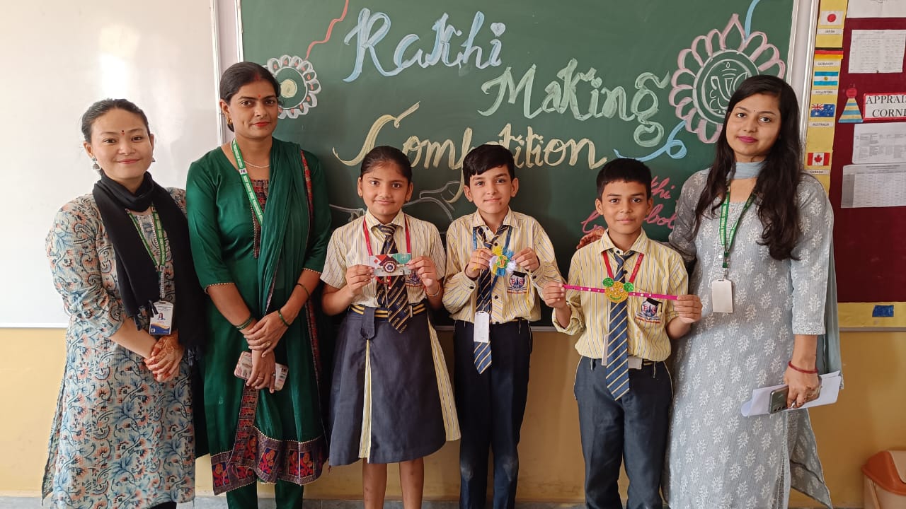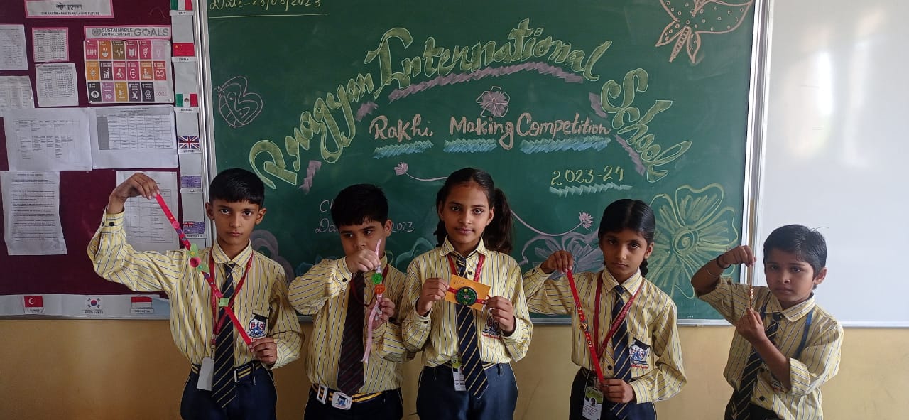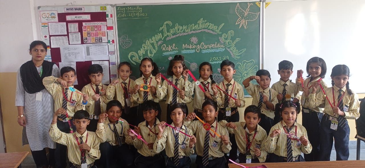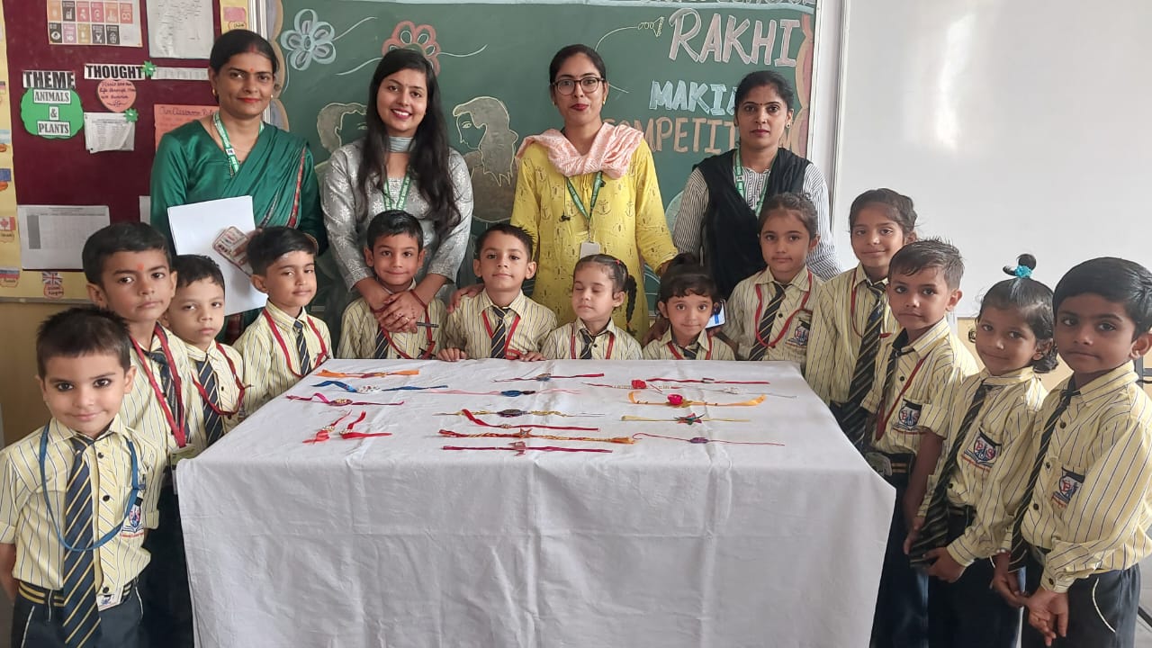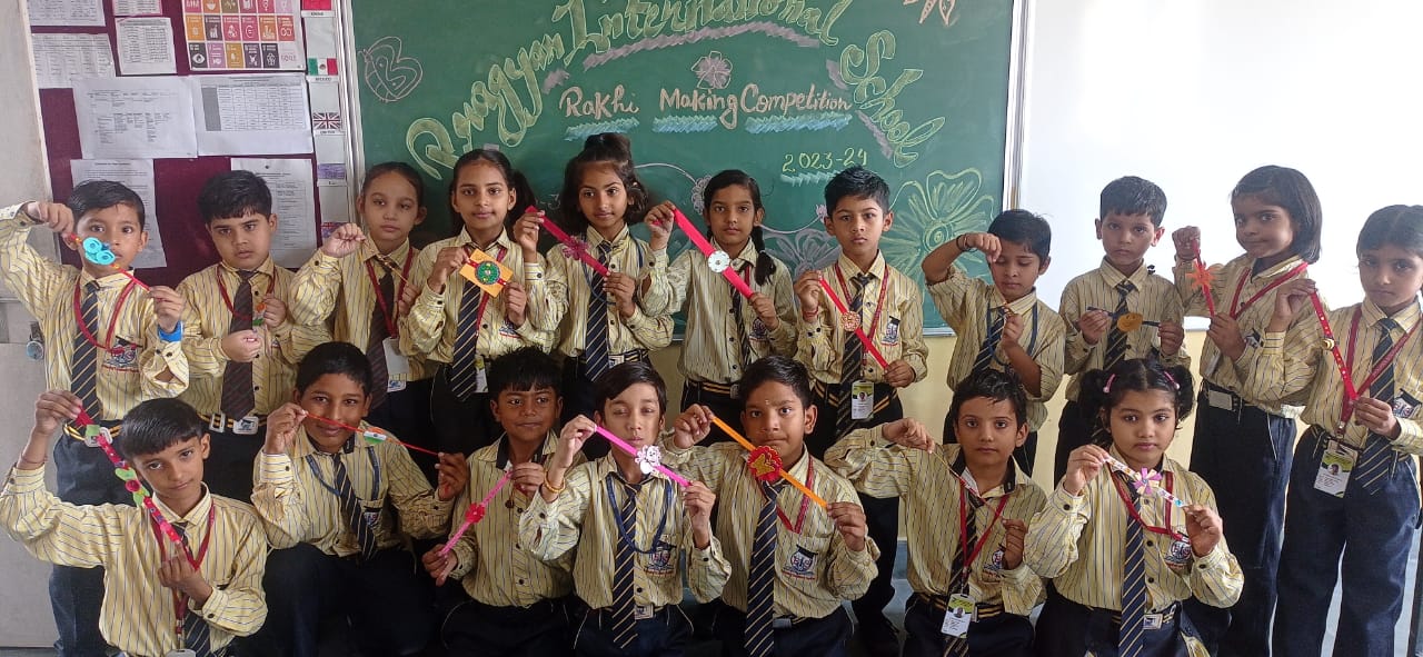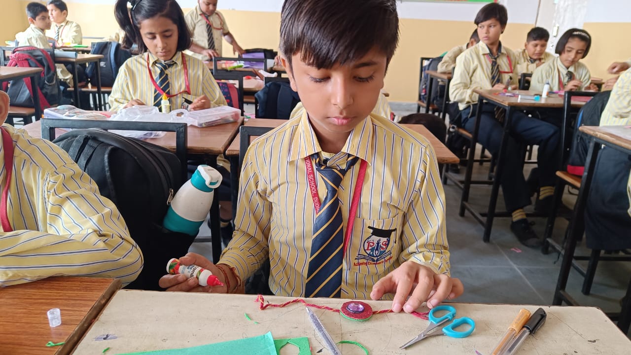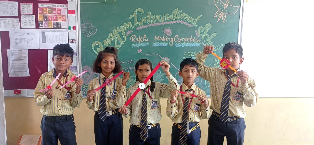 Description : 'Raksha Bandhan' or 'Rakhi' is a special occasion to celebrate the virtuous bond of love between a brother and a sister which is one of the deepest and noblest of all human emotions. 'Pragyan International School,Dudhera, organized'Rakhi Making Competition for the students from Class UKG to V and Mehandi Competition class VI to VIII on 28th August. The motive behind organizing competition is to enhance the skill of creativity and nurturing their inner talent.The competition started with full of enthusiasm among the students.All the students made beautiful Rakhi and Mehandi using different materials like ribbon, glitter,pearls, herbal etc under the guidance of their teachers .All the students thoroughly enjoyed the competition
