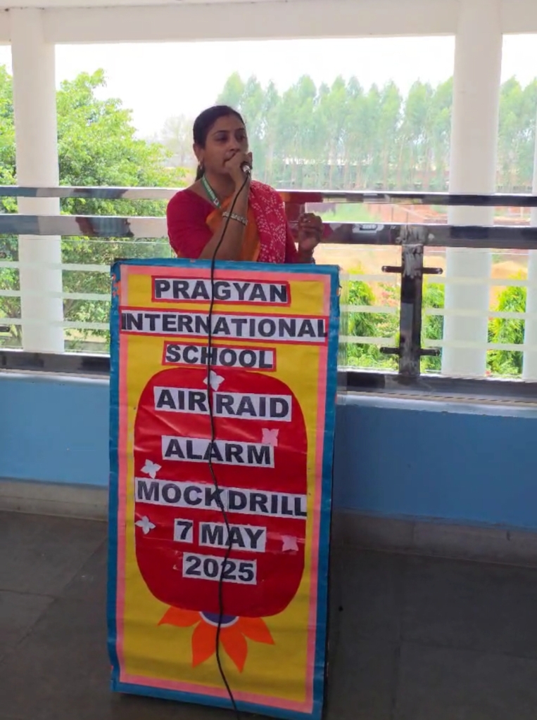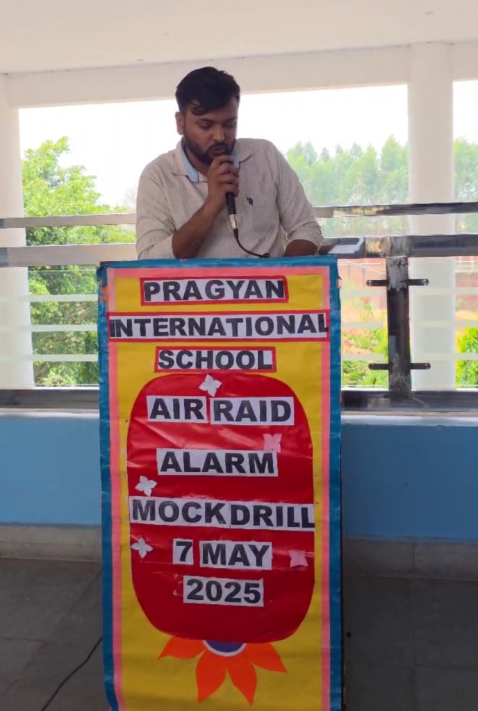 Description : Pragyan International School, Dudhera, Jewar (Gautam Buddh Nagar) conducted a mock drill to prepare students for emergency situations amid rising tensions with Pakistan. Guided by School Manager Dr. Harish Kumar Sharma and Principal Dr. Deepti Sharma, students learned key wartime safety protocols, including reaching safe zones, maintaining discipline, using resources wisely, and giving basic first aid. The drill aimed to build awareness and confidence to act responsibly in crisis situations. #AirStrike #mockdrill #emergency #safety #wartime #safetyprotocol #DeeptiSharma #harishkumarsharma