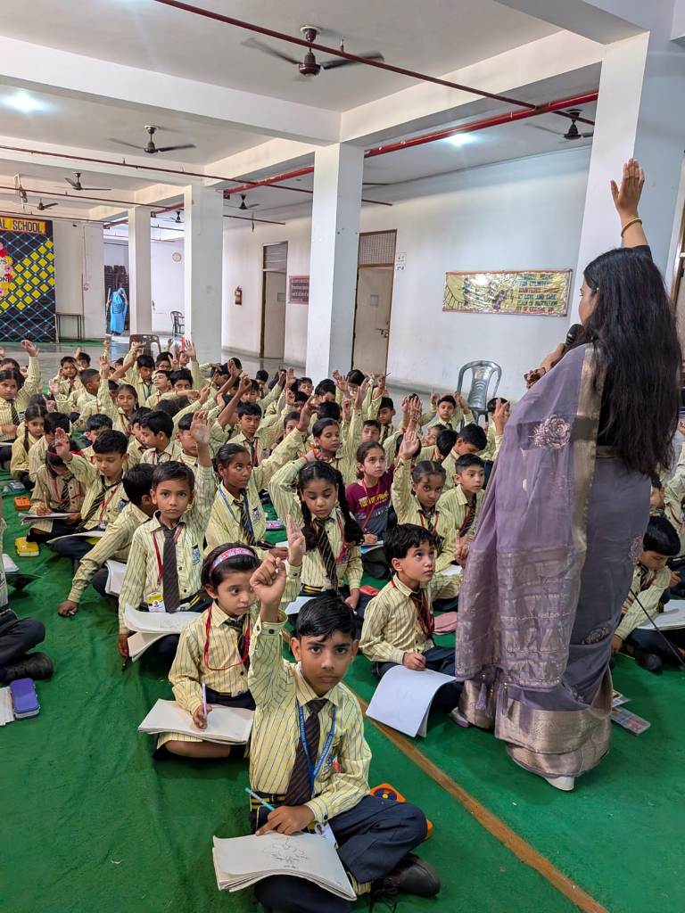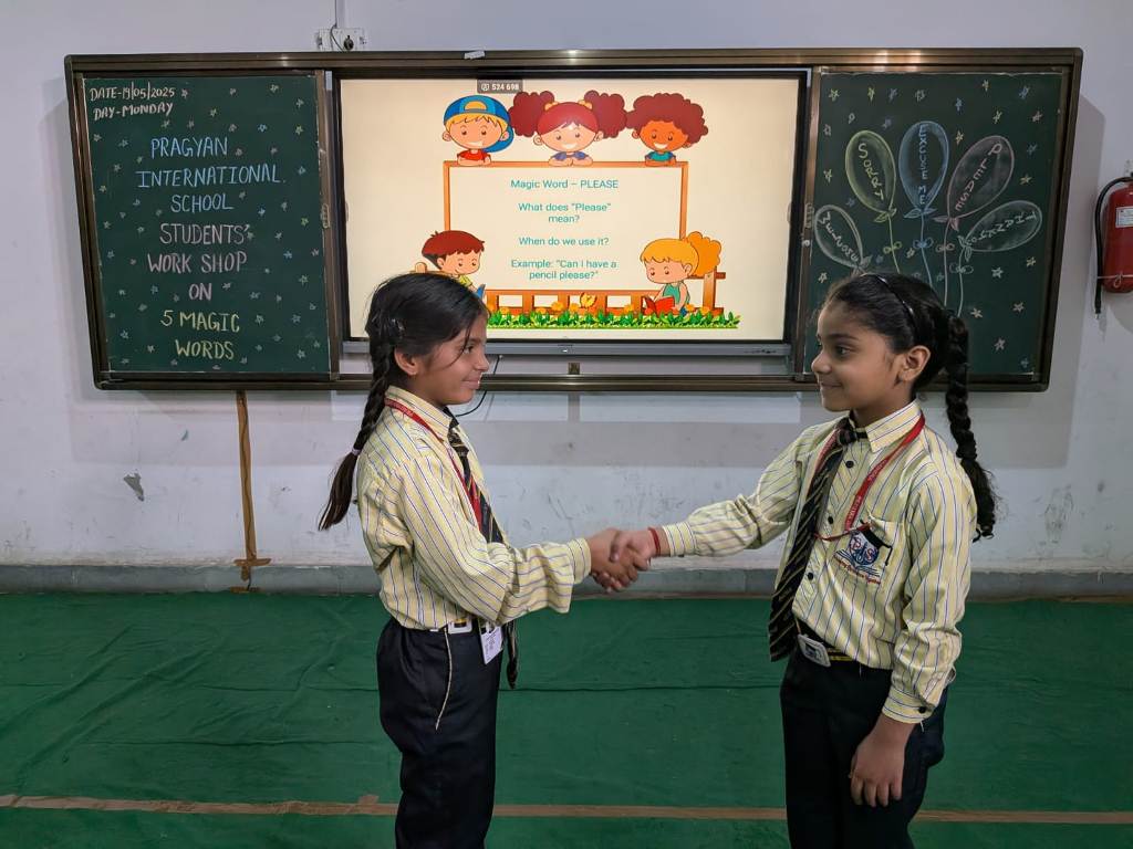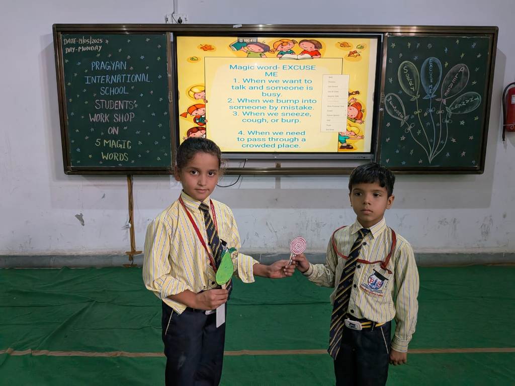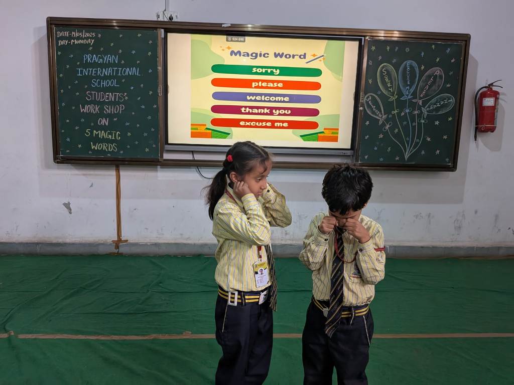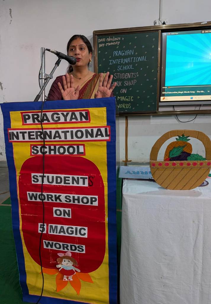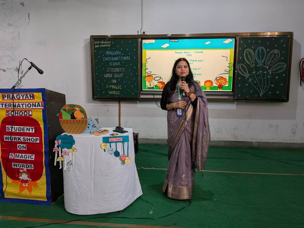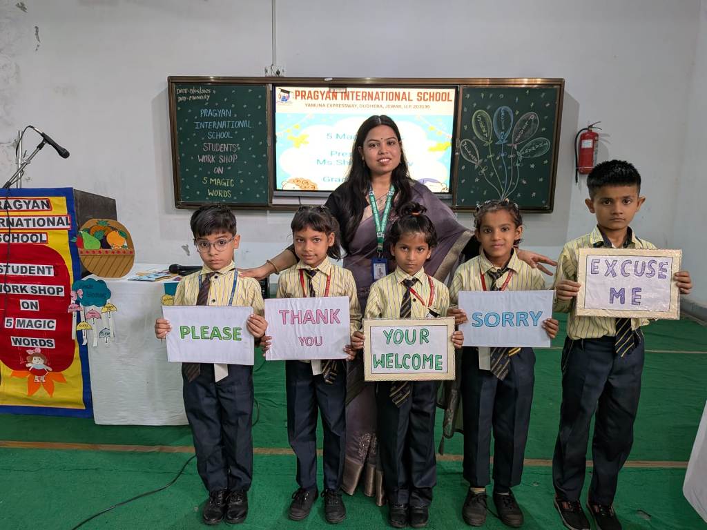 Description : Pragyan International School, Dudhera, Jewar was filled with joy and excitement as the young learners of Classes 1 and 2 participated in an engaging workshop on ‘ Five Magic Words ’, conducted by Mrs. Shikha Raghav. The session focused on teaching the importance of polite expressions—Please, Thank You, Sorry, Excuse Me, and May I—through interactive stories, and fun activities. With a warm and creative approach, Mrs. Shikha Raghav helped students understand how using these simple words can build respect, kindness, and empathy in everyday life. The school remains committed to instilling strong values and life skills from an early age, helping students grow into kind and respectful individuals.