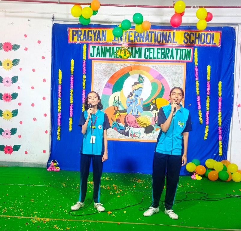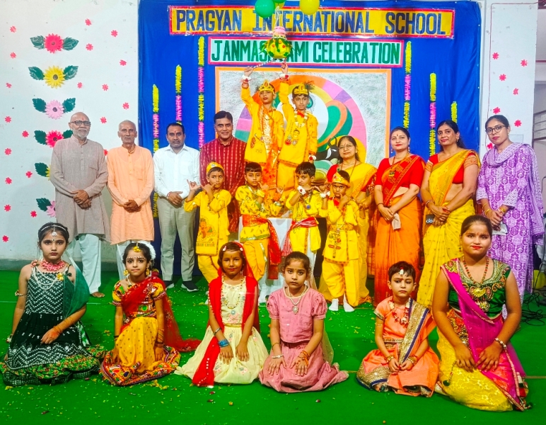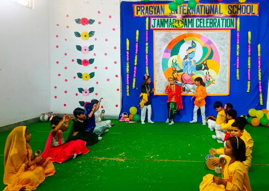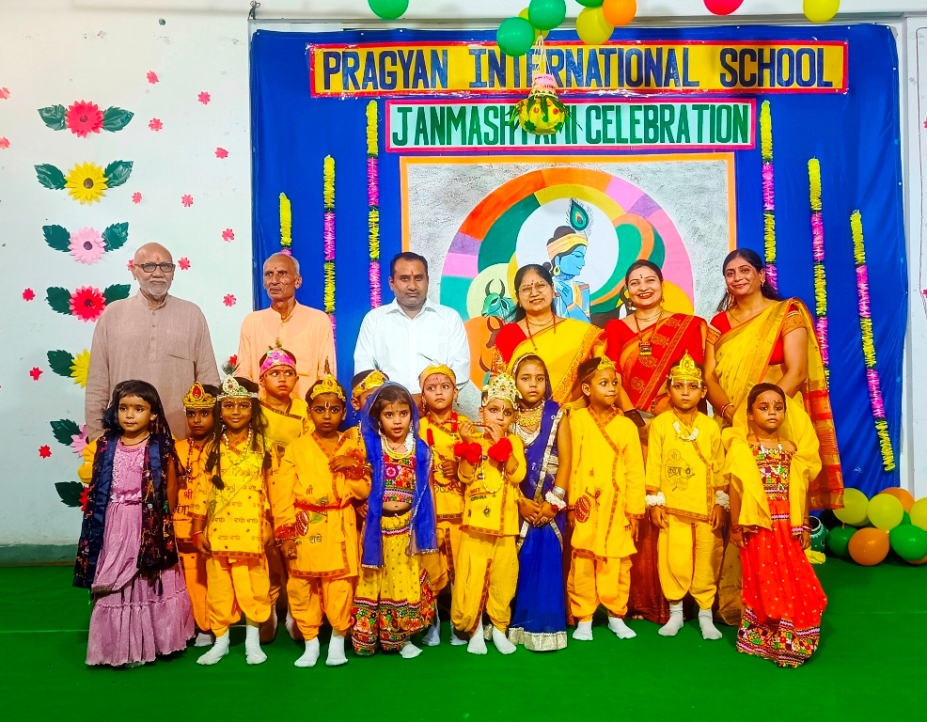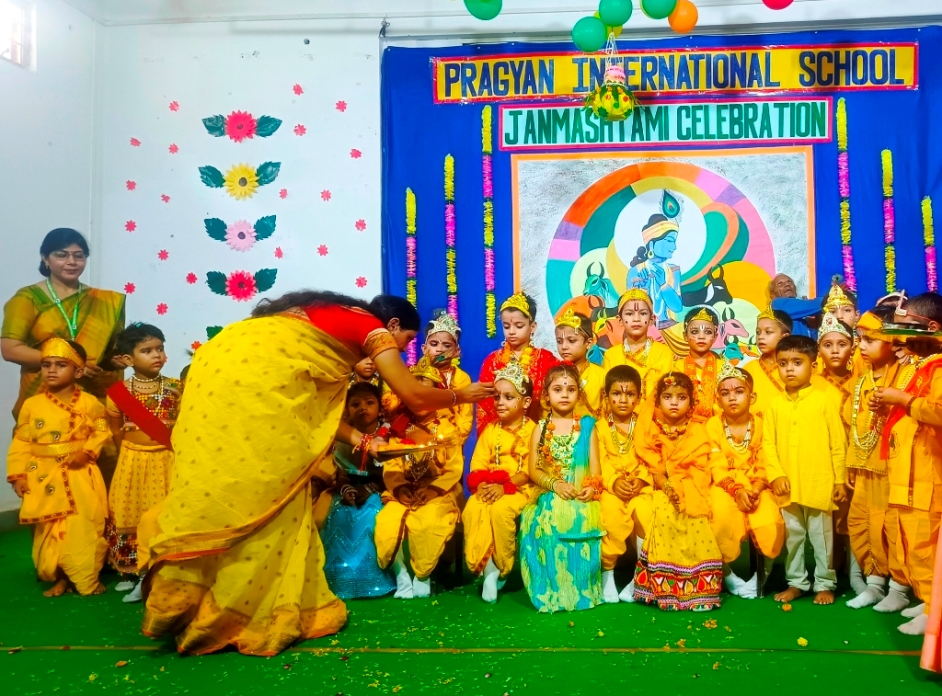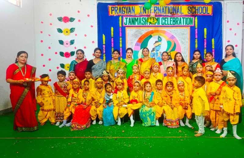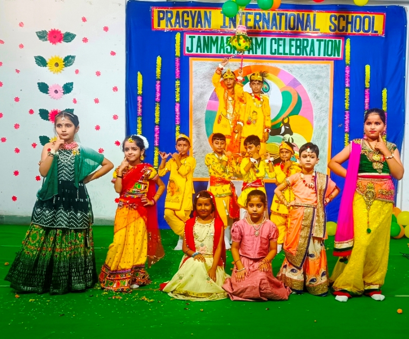 Description : The Pre-Primary wing of Pragyan International School joyfully celebrated Janmashtami on 16th August 2025 in the school hall. The event began with devotional songs, prayers, and an explanation of Janmashtami’s significance. Students performed a skit on Lord Krishna’s life, including the “Makhan Chori” episode, dressed as Krishna and Radha. Energetic group dances to Krishna bhajans and a lively “Matki Phod” event added to the festivities. The celebration was filled with devotion, fun, and cultural learning, leaving fond memories for all.