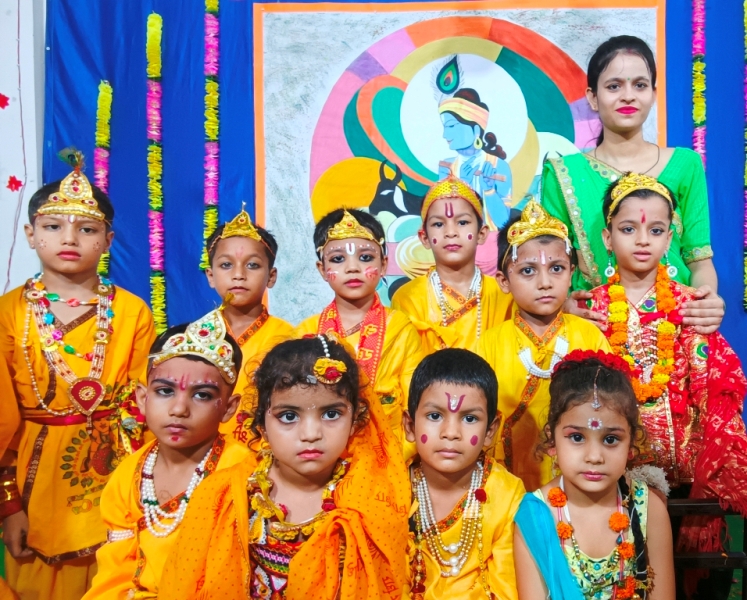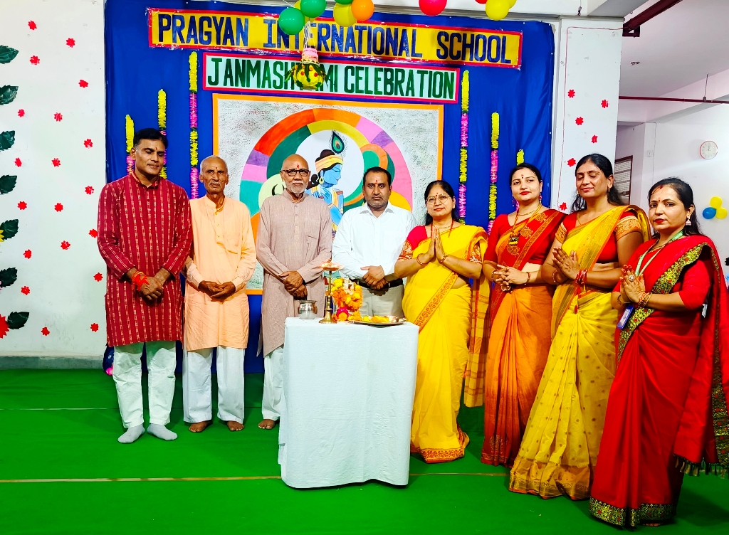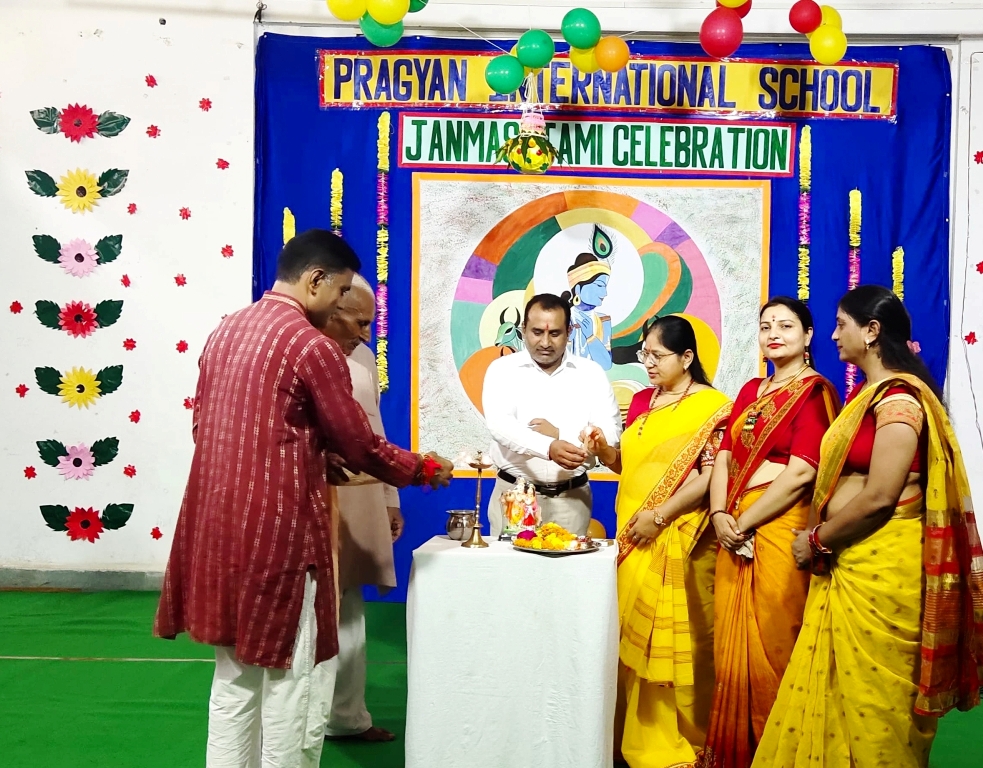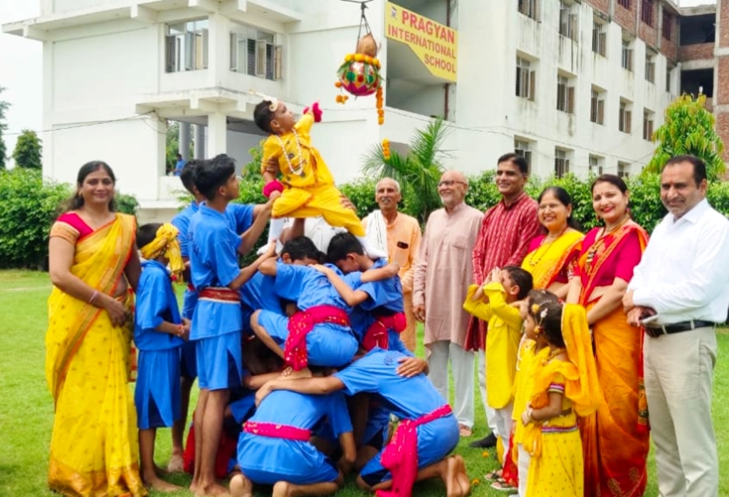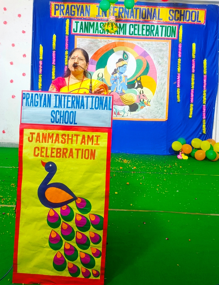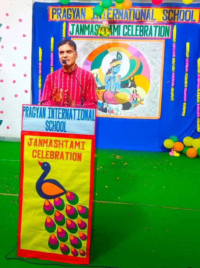 Description : The Pre-Primary wing of Pragyan International School joyfully celebrated Janmashtami on 16th August 2025 in the school hall. The event began with devotional songs, prayers, and an explanation of Janmashtami’s significance. Students performed a skit on Lord Krishna’s life, including the “Makhan Chori” episode, dressed as Krishna and Radha. Energetic group dances to Krishna bhajans and a lively “Matki Phod” event added to the festivities. The celebration was filled with devotion, fun, and cultural learning, leaving fond memories for all.