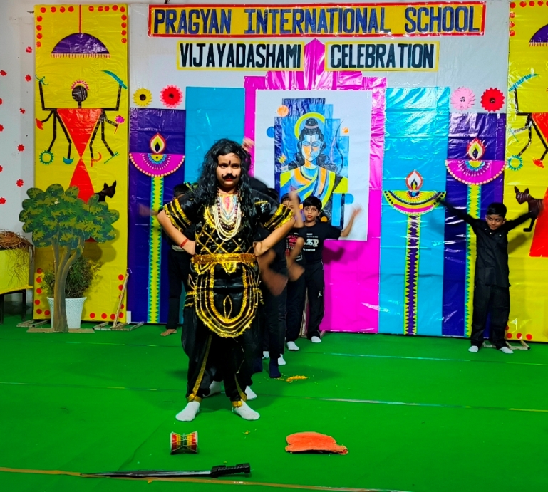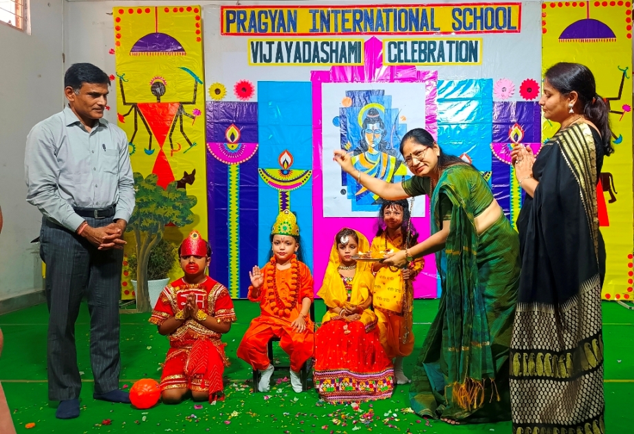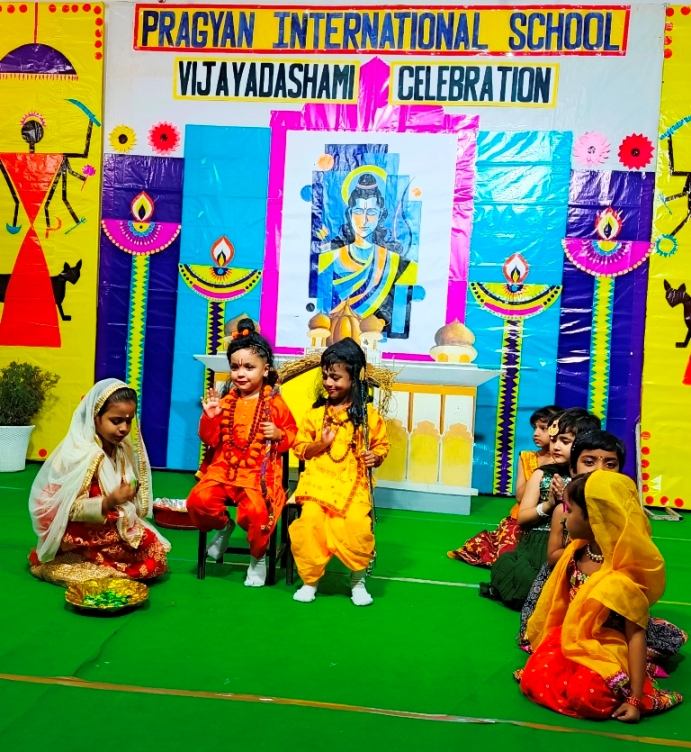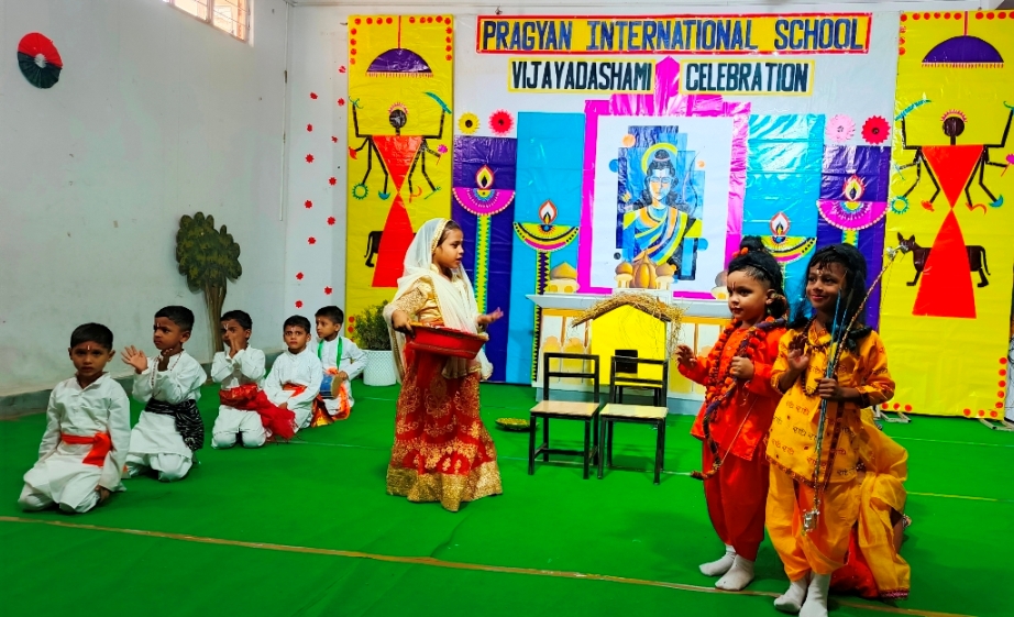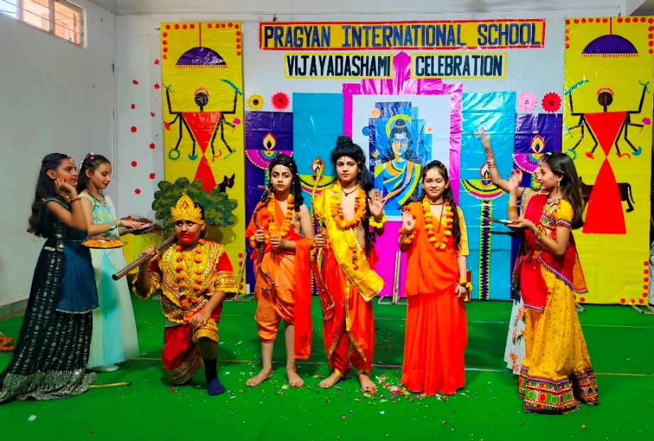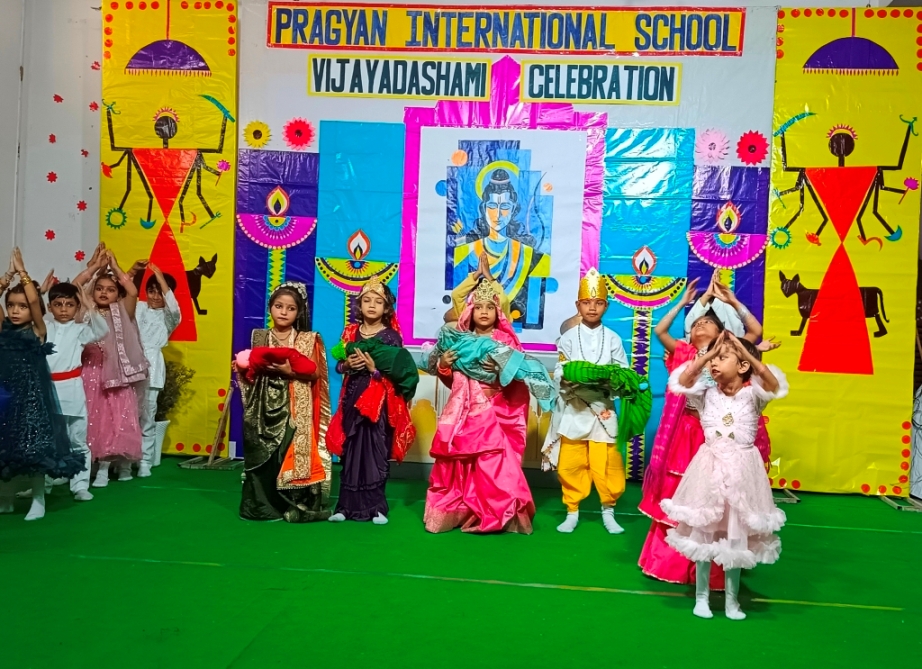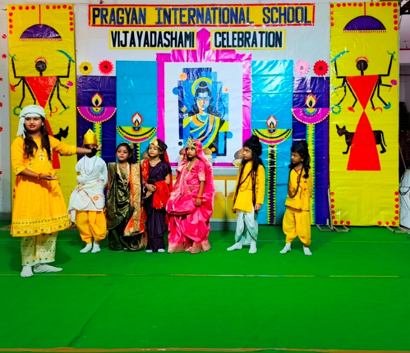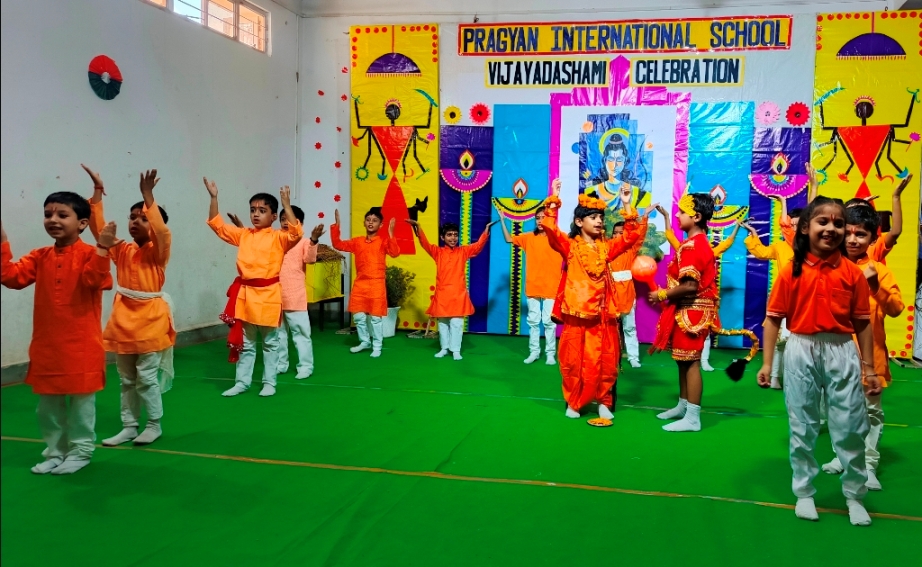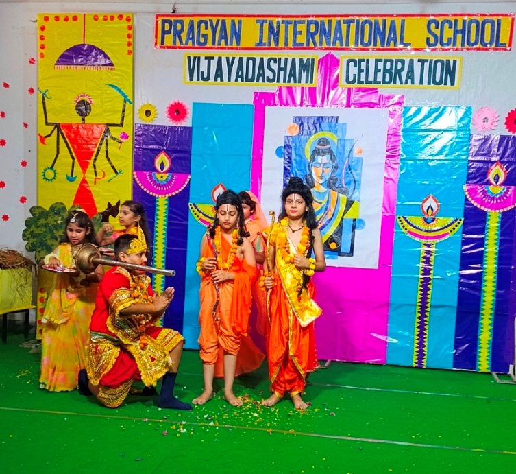 Description : Pragyan International School celebrated Vijayadashami with great enthusiasm. Students from Nursery to Class 5 showcased the essence of the Ramayan through wonderful performances — from Ram Janam to the grand Ravan Vadh. The audience was spellbound by the devotion and energy of our little ones. The program began with the welcome of our esteemed guests, Respected Manager Sir Dr. Harish Kumar Sharma and Dr. Deepti Sharma, followed by Saraswati Vandana. A mesmerizing Navdurga dance and a colorful Dandiya performance by senior students added joy to the celebration. The event concluded with the heartfelt vote of thanks and a soulful Shree Ram Aarti, spreading the timeless message of victory of good over evil.