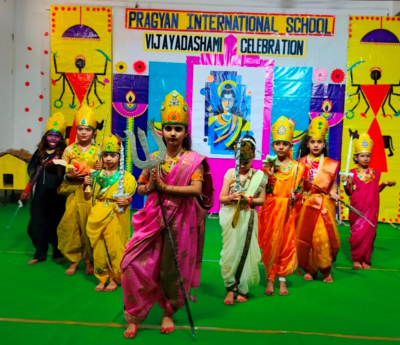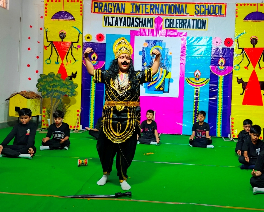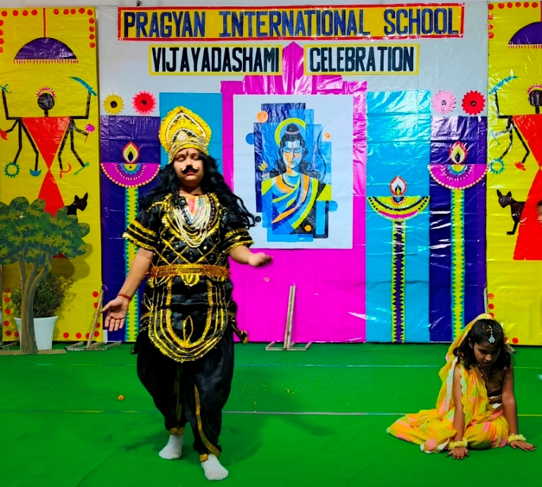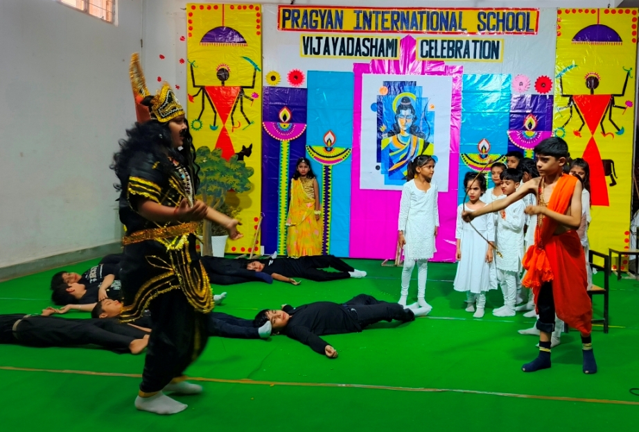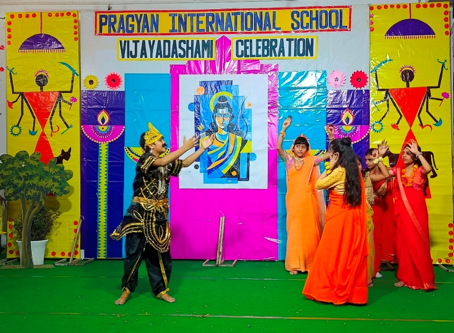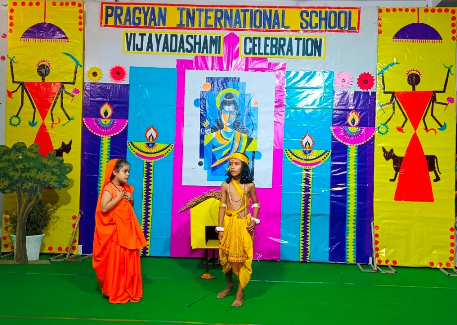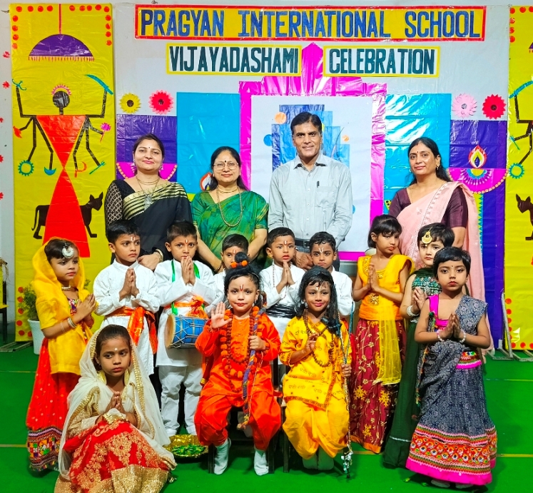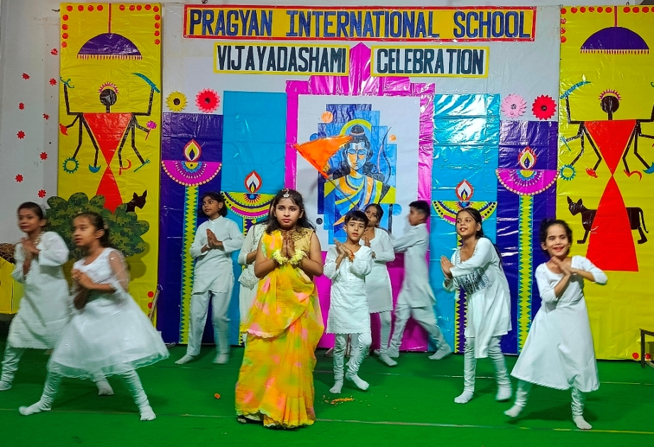 Description : Pragyan International School celebrated Vijayadashami with great enthusiasm. Students from Nursery to Class 5 showcased the essence of the Ramayan through wonderful performances — from Ram Janam to the grand Ravan Vadh. The audience was spellbound by the devotion and energy of our little ones. The program began with the welcome of our esteemed guests, Respected Manager Sir Dr. Harish Kumar Sharma and Dr. Deepti Sharma, followed by Saraswati Vandana. A mesmerizing Navdurga dance and a colorful Dandiya performance by senior students added joy to the celebration. The event concluded with the heartfelt vote of thanks and a soulful Shree Ram Aarti, spreading the timeless message of victory of good over evil.