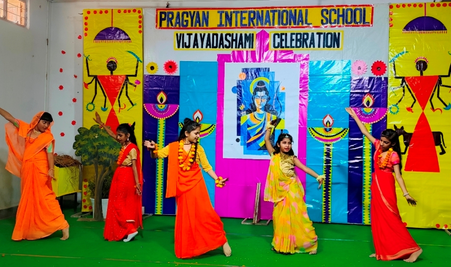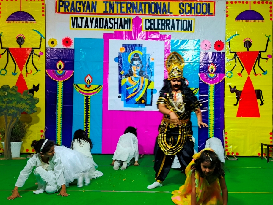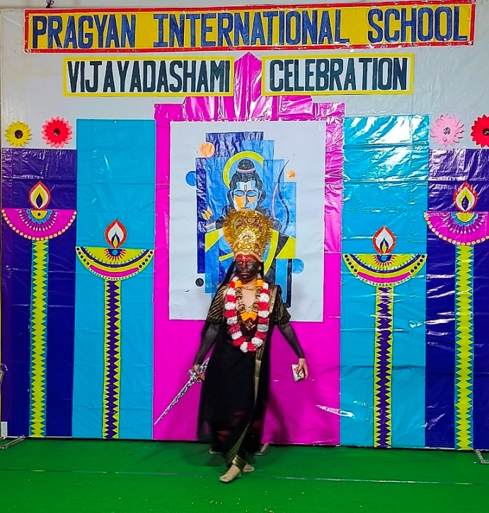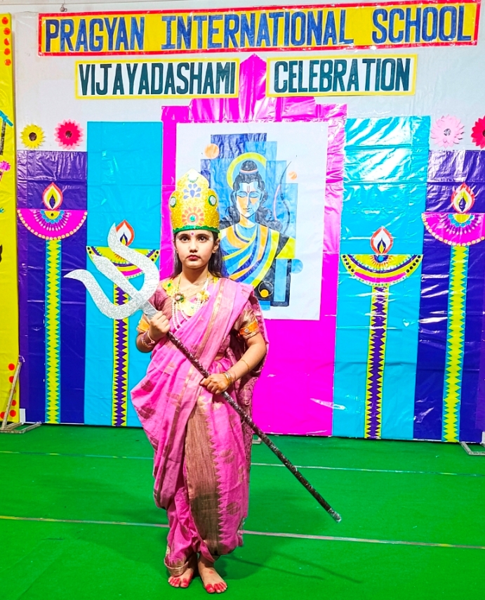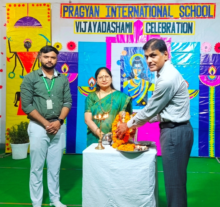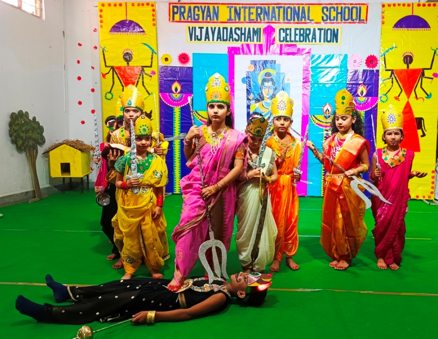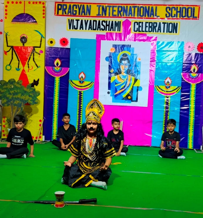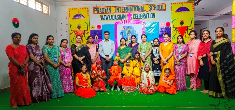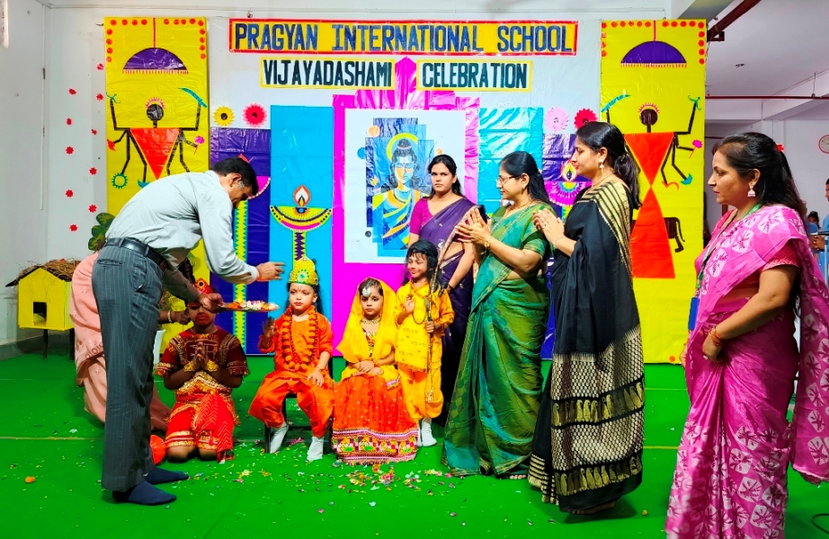 Description : Pragyan International School celebrated Vijayadashami with great enthusiasm. Students from Nursery to Class 5 showcased the essence of the Ramayan through wonderful performances — from Ram Janam to the grand Ravan Vadh. The audience was spellbound by the devotion and energy of our little ones. The program began with the welcome of our esteemed guests, Respected Manager Sir Dr. Harish Kumar Sharma and Dr. Deepti Sharma, followed by Saraswati Vandana. A mesmerizing Navdurga dance and a colorful Dandiya performance by senior students added joy to the celebration. The event concluded with the heartfelt vote of thanks and a soulful Shree Ram Aarti, spreading the timeless message of victory of good over evil.