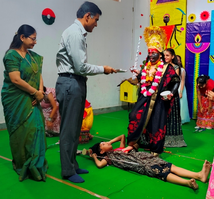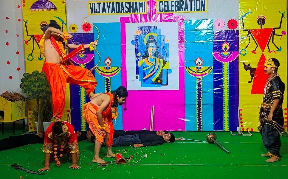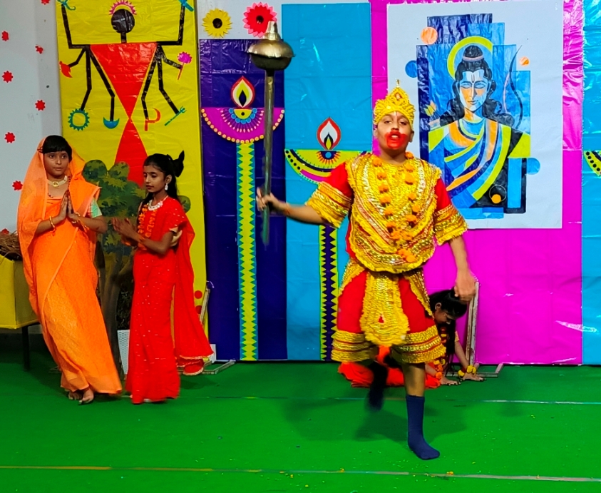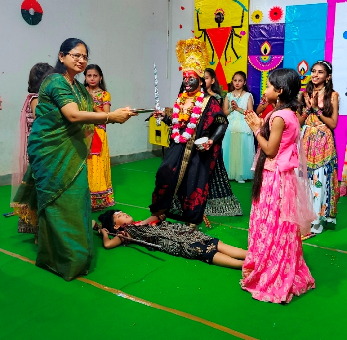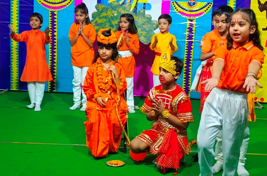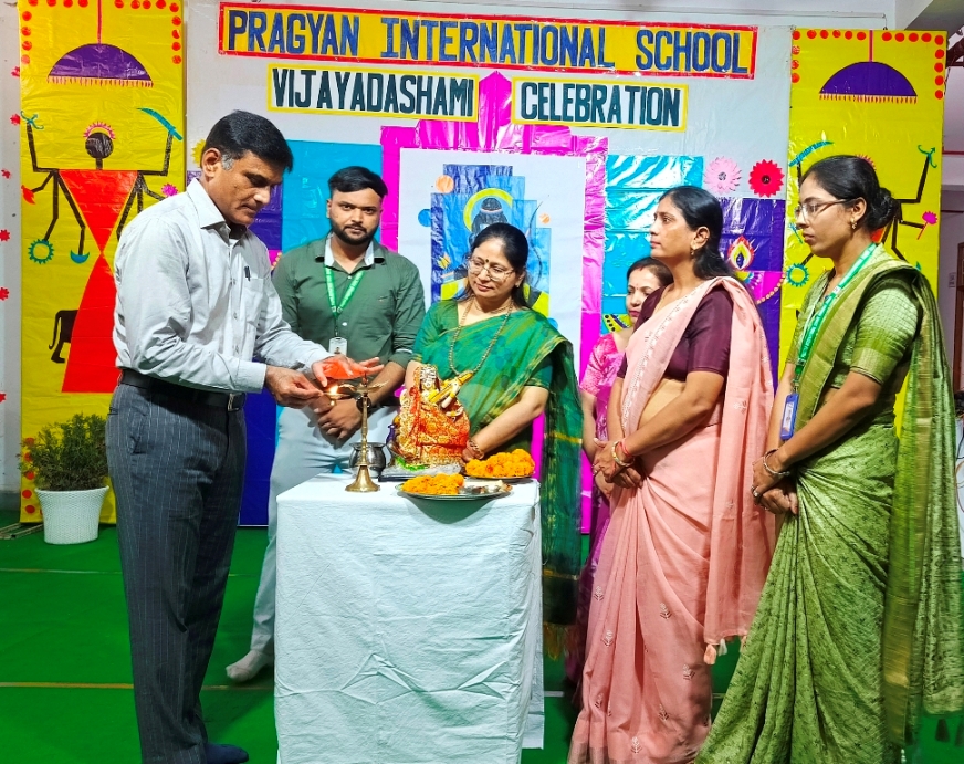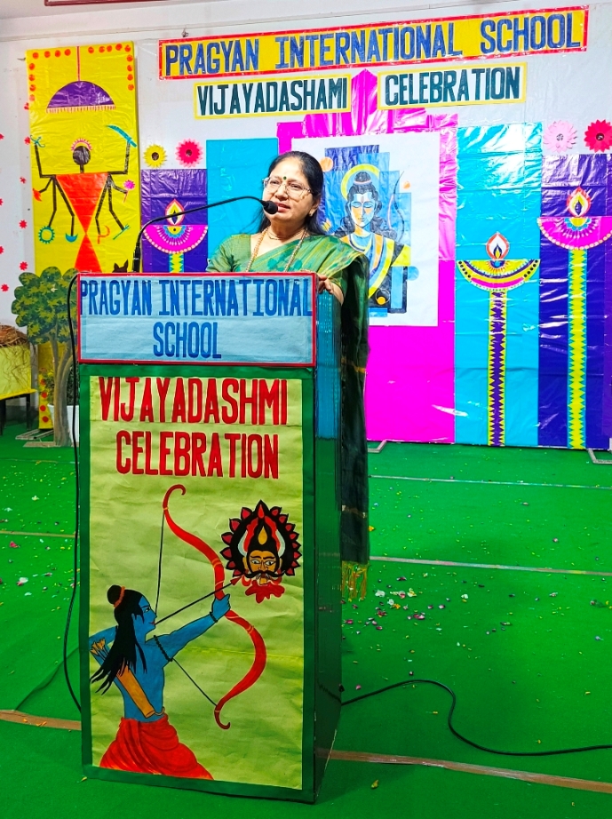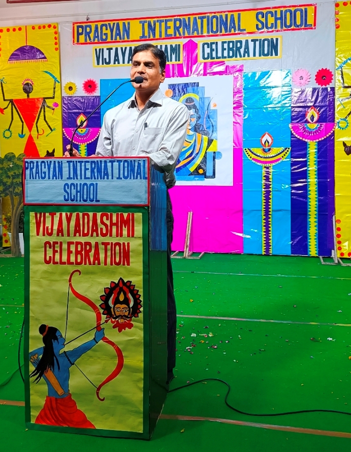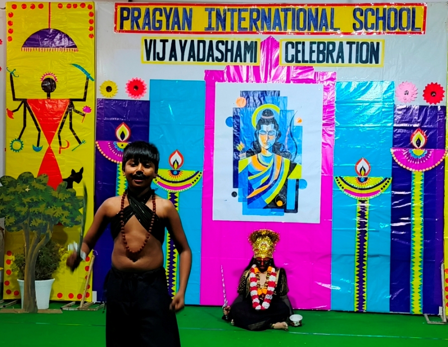 Description : Pragyan International School celebrated Vijayadashami with great enthusiasm. Students from Nursery to Class 5 showcased the essence of the Ramayan through wonderful performances — from Ram Janam to the grand Ravan Vadh. The audience was spellbound by the devotion and energy of our little ones. The program began with the welcome of our esteemed guests, Respected Manager Sir Dr. Harish Kumar Sharma and Dr. Deepti Sharma, followed by Saraswati Vandana. A mesmerizing Navdurga dance and a colorful Dandiya performance by senior students added joy to the celebration. The event concluded with the heartfelt vote of thanks and a soulful Shree Ram Aarti, spreading the timeless message of victory of good over evil.
