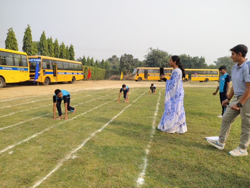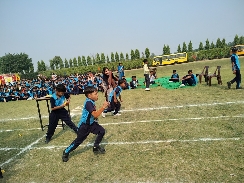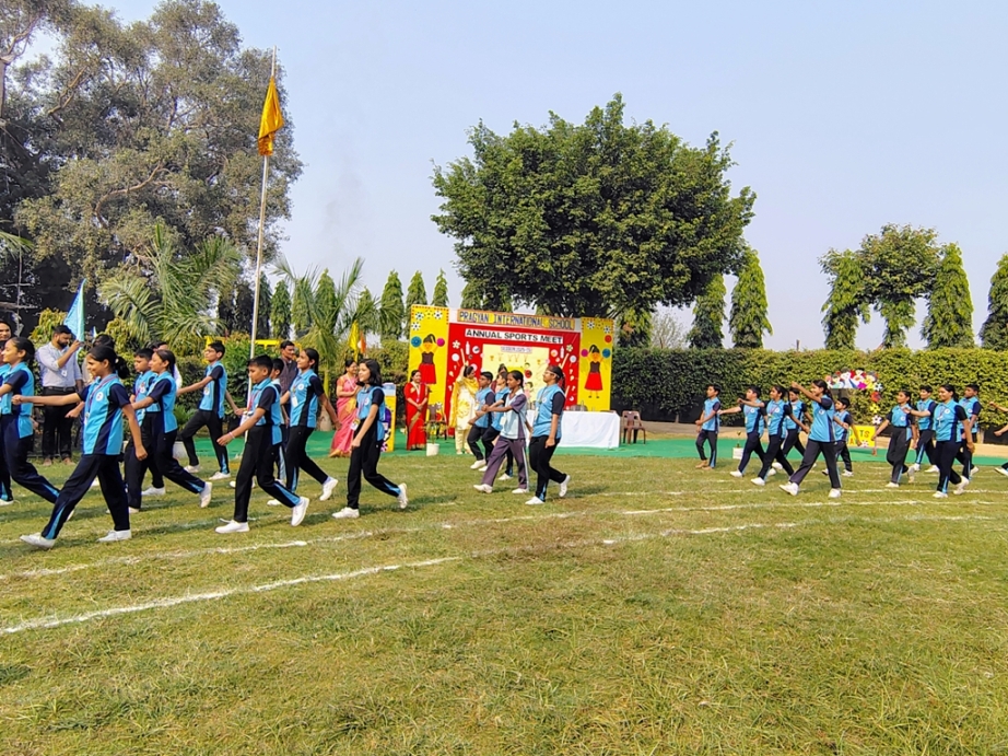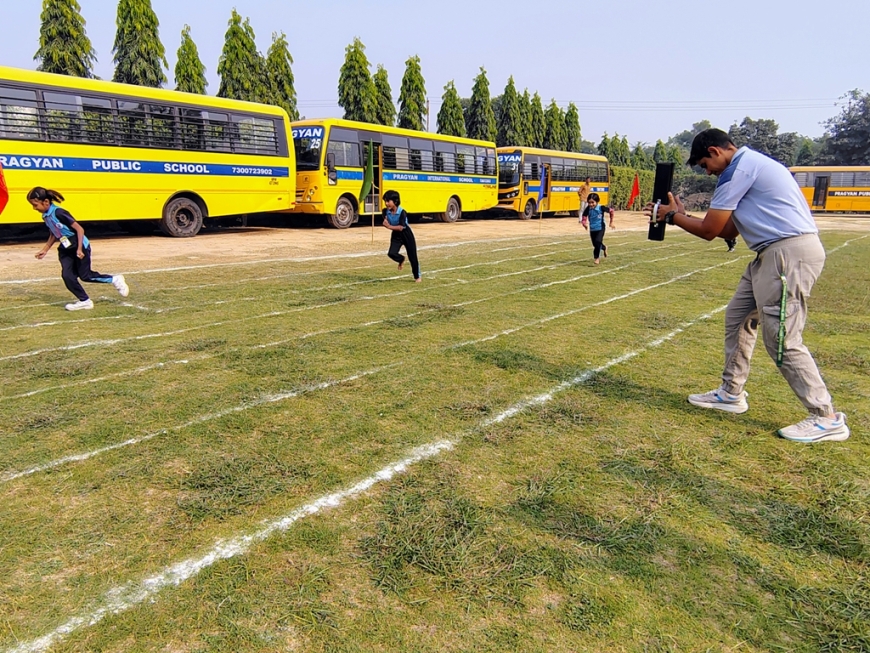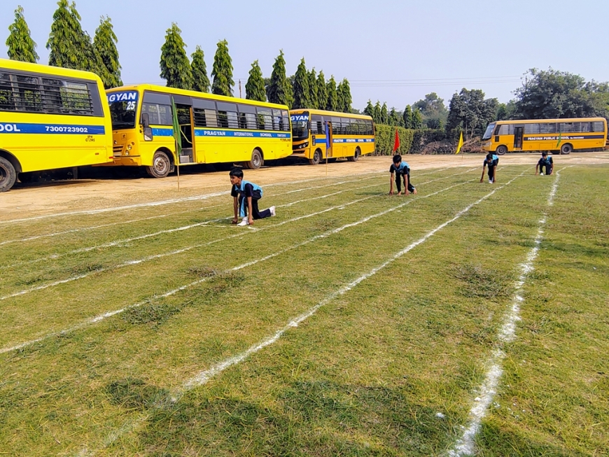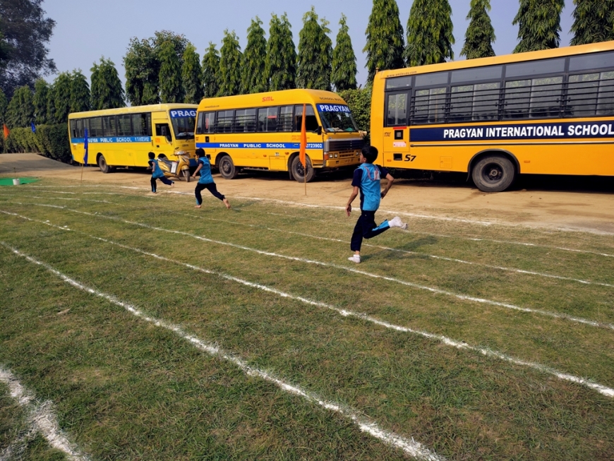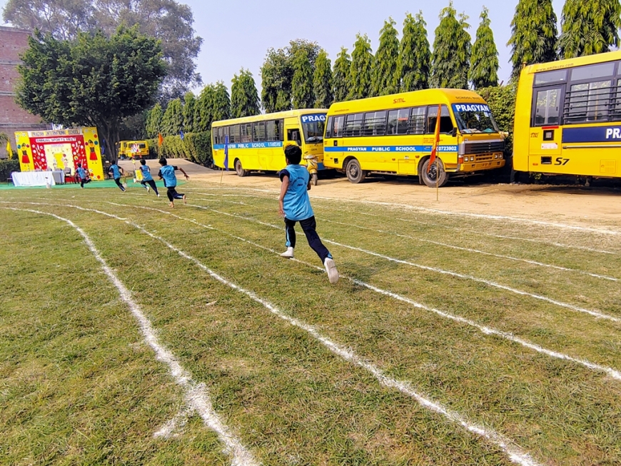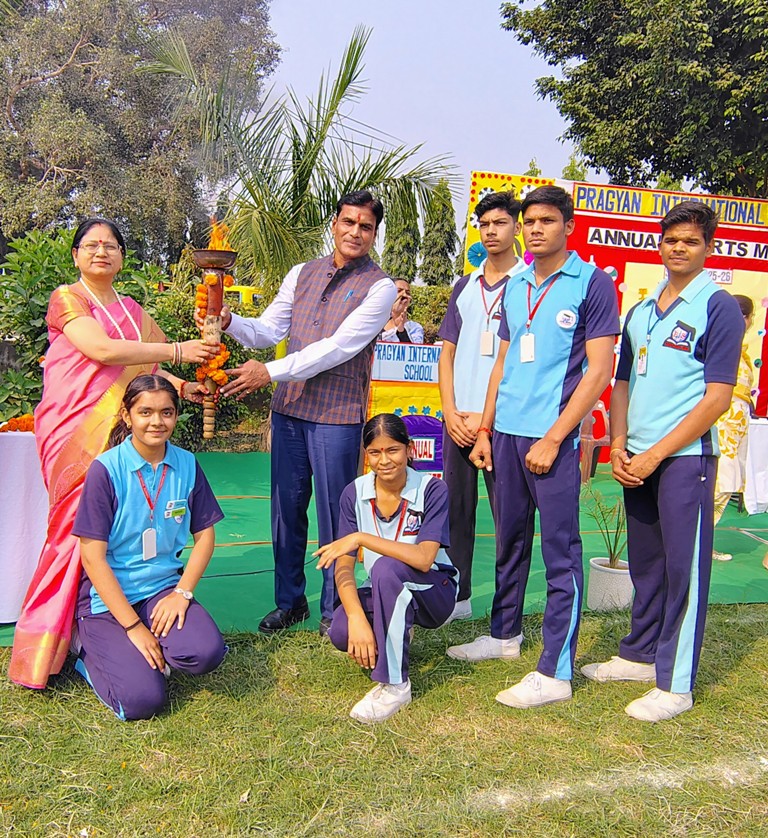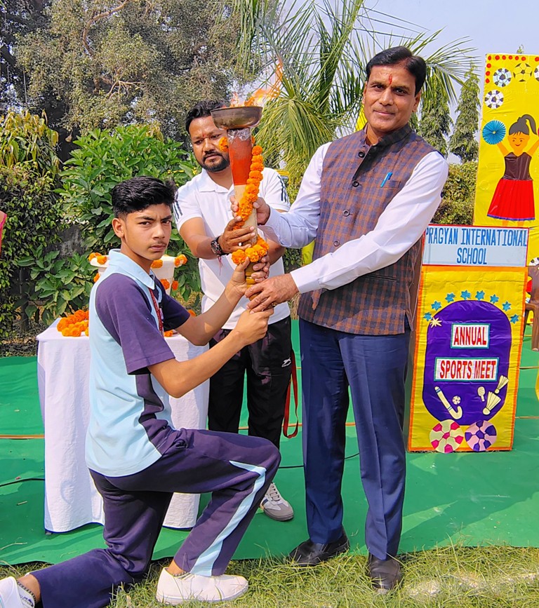 Description : The playground of Pragyan International School came alive with boundless excitement as the Annual Sports Fiesta 2025–26 commenced with a grand torch-lighting ceremony, graced by School Manager Dr. Harish Kumar Sharma, Principal Dr. Deepti Sharma, School In-Charge Dr. Priyanka Sharma, and other esteemed dignitaries — invoking the spirit of success, strength, and sportsmanship. The ceremony was followed by a spectacular March Past, showcasing the students’ unity, discipline, and athletic pride. The Fiesta was officially declared open when Principal Dr. Deepti Sharma waved the green flag, signaling the start of the much-awaited events. Motivational words from the dignitaries uplifted the young athletes, inspiring them to play with determination and fair spirit. Under the guidance of Mr. Vishal (P.E.T), a series of thrilling events 30m, 50m, 100m, 200m, Hurdle, Sack, Balloon, Biscuit, Banana, Lemon, 3-Leg Race, and Tug of War filled the grounds with cheers, teamwork, and unforgettable enthusiasm!